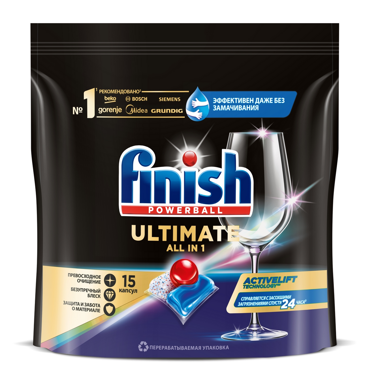 Обеспечивают превосходное очищение и безупречный блеск с первого раза. Технология activelift эффективно справляется с засохшими загрязнениями даже спустя 24 часа без предварительного замачивания. Каждая капсула состоит из трех частей: порошковая удаляет сложные загрязнения, синий гель нейтрализует жир, красный гель придает ослепительный блеск. Более того, таблетки для посудомоечной машины Finish Ultimate защищают стеклянную посуду и столовые приборы от помутнения, сохраняя их блеск после мытья. Для достижения максимального результата и при очень жесткой воде рекомендуем попробовать специальную соль и ополаскиватель Finish