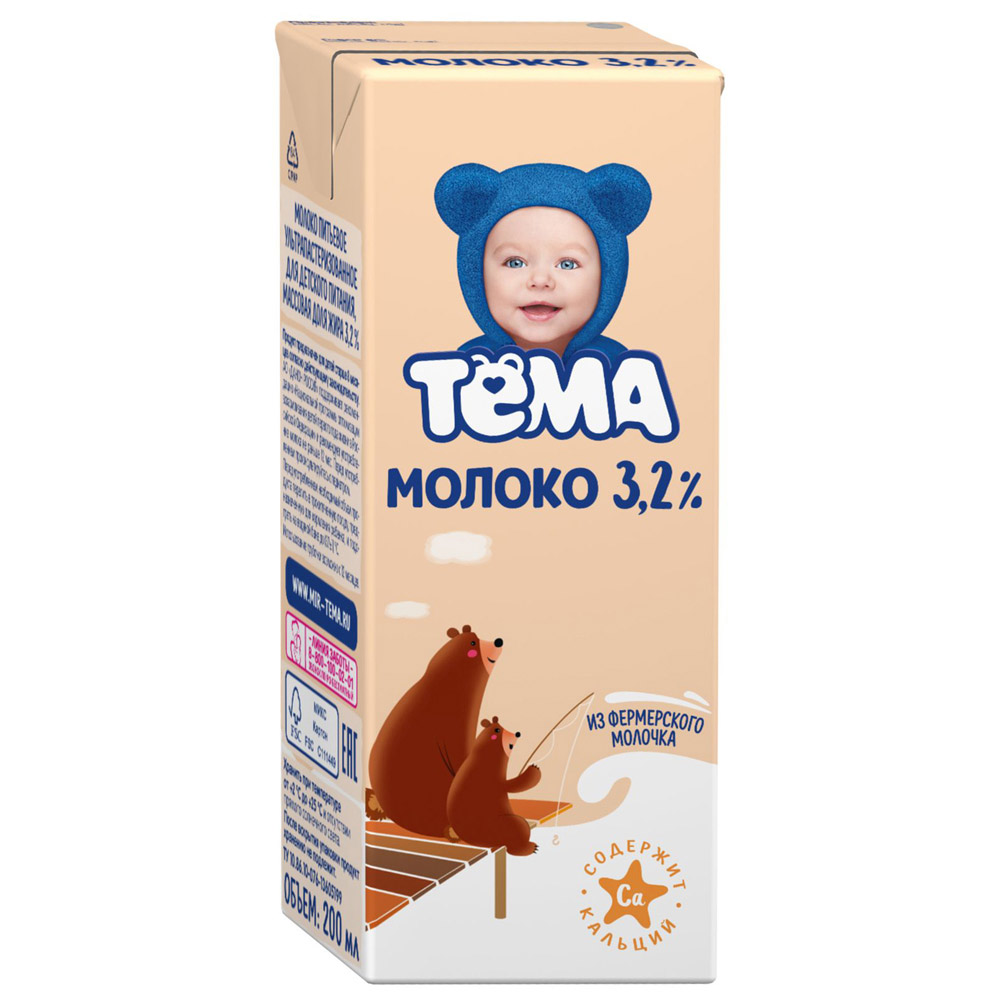 Молоко Тема питьевое ультрапастеризованное для детей с 12месяцев, 3,2% 200г