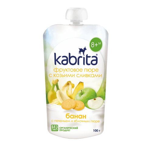 Пюре Kabrita фруктовое с козьими сливками банан с печеньем с яблочным пюре с 6 месяцев