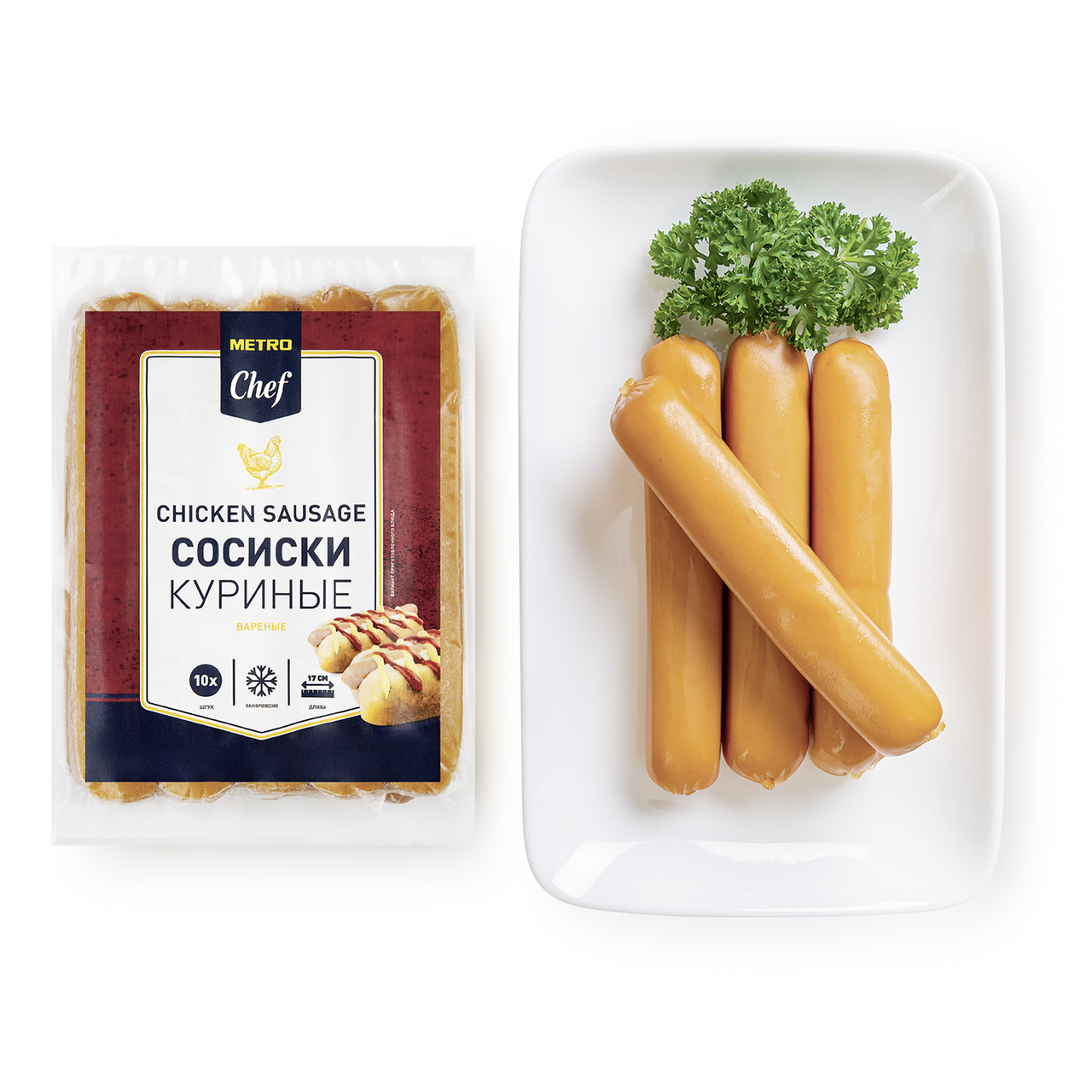 Сосиски куриные Metro Chef замороженные в вакуумной упаковке, 750г – продукт, который одинаково любят как дети, так и взрослые. Сосиски сделаны из нежного куриного филе с добавлением ароматных специй. Поставляются они в замороженном виде, но готовятся очень быстро. Их можно отварить в кипящей воде, обжарить на сковороде или разогреть в микроволновой печи. Без этого продукта не обходится ни один завтрак. Сосисками дополняют омлет и яичницу, с ними делают хот-доги и прочие бутерброды, их используют для начинки пиццы и несладких пирогов, добавляют в окрошку и солянку, сопровождают ими макароны, гречку и рис, едят сами по себе. Сосиски достаточно сытные и калорийные, поэтому быстро утоляют голод, восполняют силы и заряжают энергией на длительное время. В составе продукта нет ГМО и сои. В умеренном количестве пельмени не навредят фигуре. Продукт заключен в вакуумную упаковку, которая надежно сохраняет вкус и аромат продукции в течение всего срока годности. Приобрести сосиски куриные Metro Chef замороженные в вакуумной упаковке, 750г можно в торговом центре METRO.Товары под брендом METRO Chef разработаны и протестированы совместно с представителями ресторанного бизнеса. Это продукты, созданные шеф-поварами для шеф-поваров и людей, увлеченных гастрономией. Это качество, отвечающее высоким требованиям профессионалов ресторанного бизнеса. Это большие упаковки и оптовые цены.