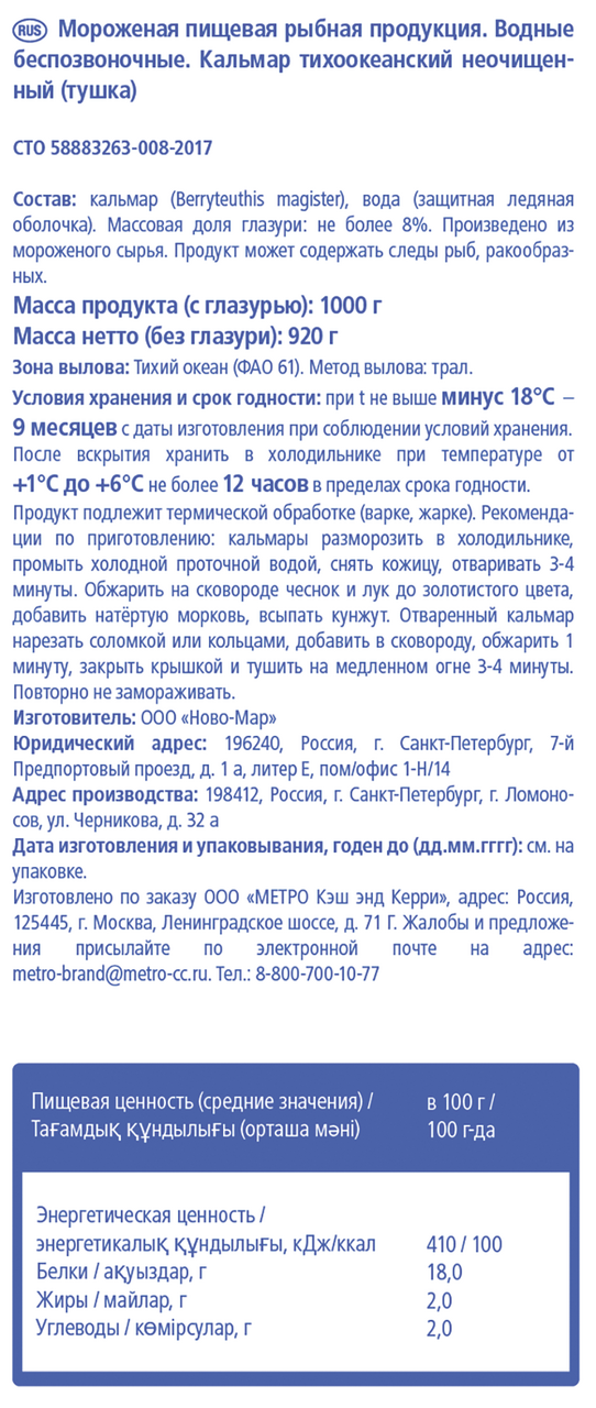 Aro Кальмар тихоокеанский тушка неочищенная свежемороженая, 1кг