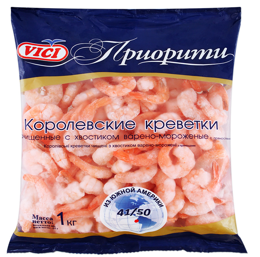 Креветки Королевские очищенные с хвостиком Vici варено-мороженые с пряностями 41\/50 1 кг